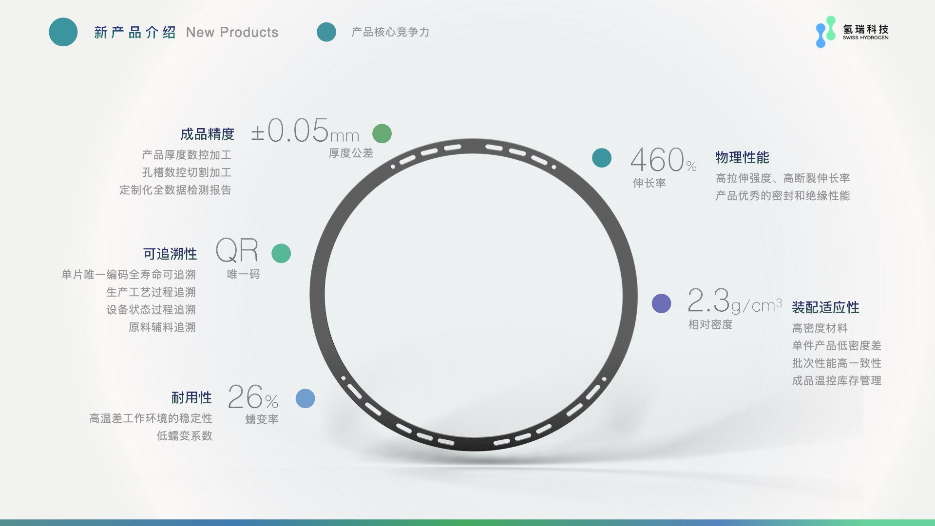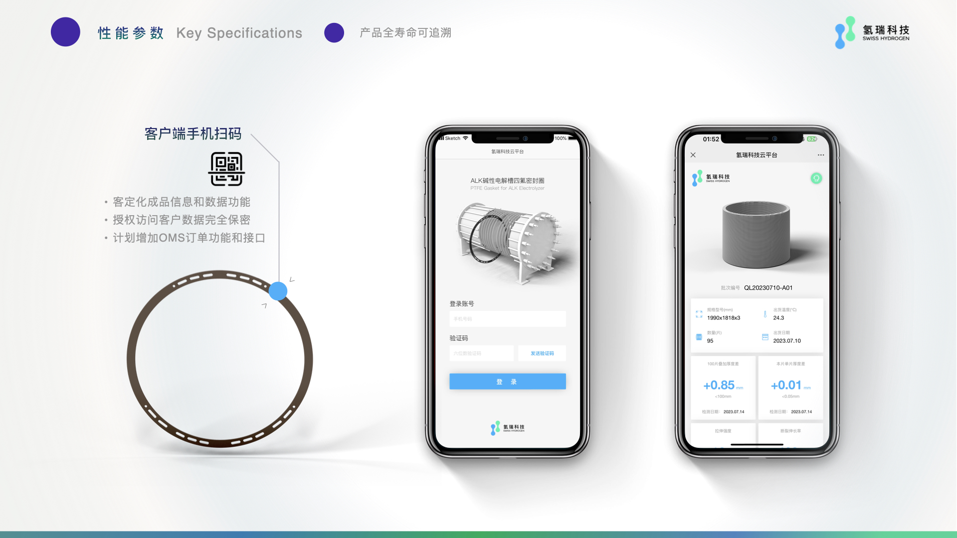 江苏氢瑞研发生产的碱性电解槽高性能改性聚四氟乙烯密封垫片具有高加工精度、批次性能指标高一致性、材料高回弹率、低蠕变率、易装配易适应等核心优势。采用了业内前沿的智能化MES生产管理和QMS数字化过程质量管理体系,产品质量稳定,且在业内首次推出了产品可追溯QR唯一码,帮助客户实现零部件全寿命可追溯管理。密封垫片规格可按客户需求制作,最大加工直径可达2500mm。